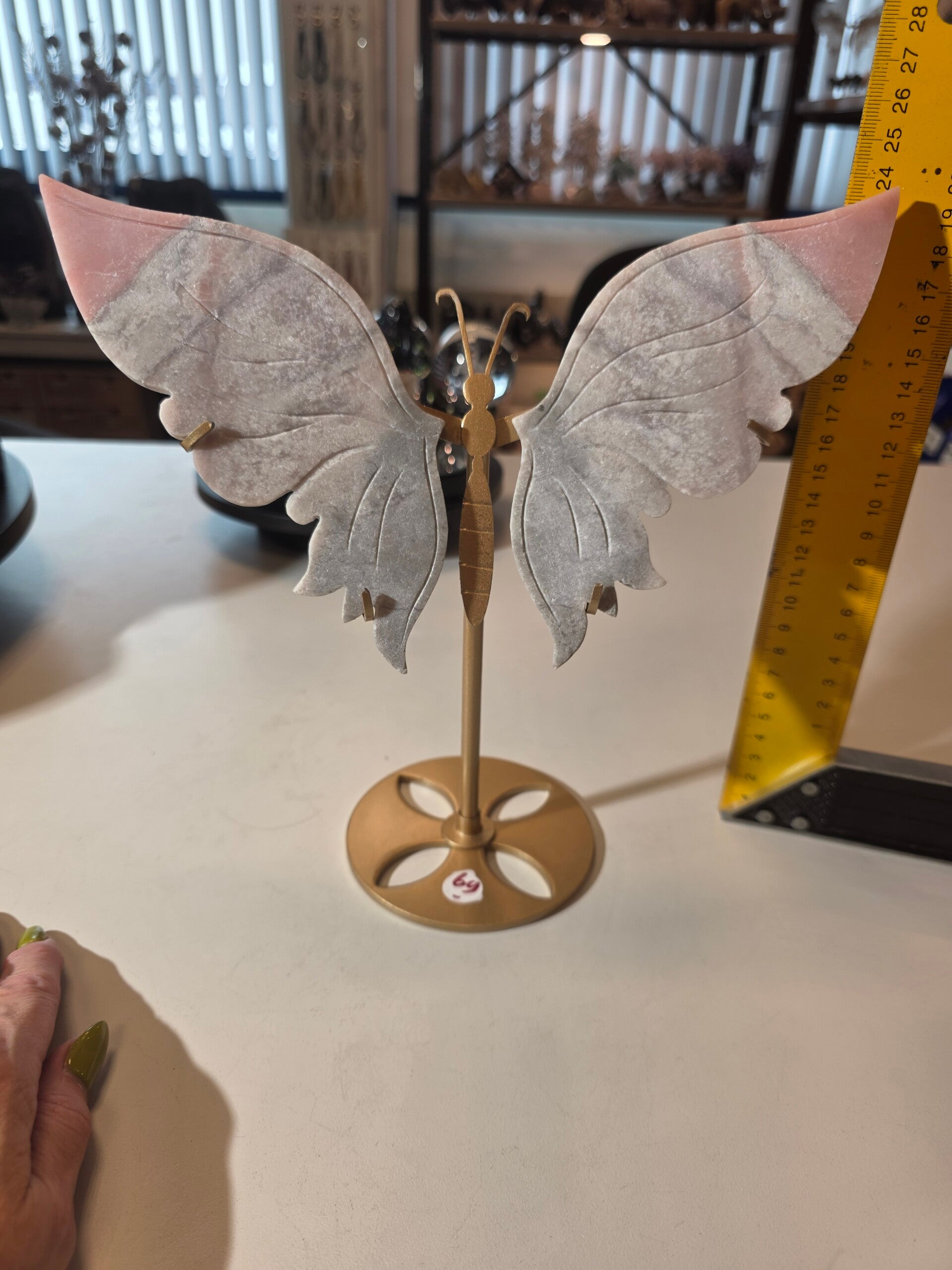 Prachtige grote roze opaal vlinder 24cm hoog en 24cm breed met prachtige Banding op gouden standaard