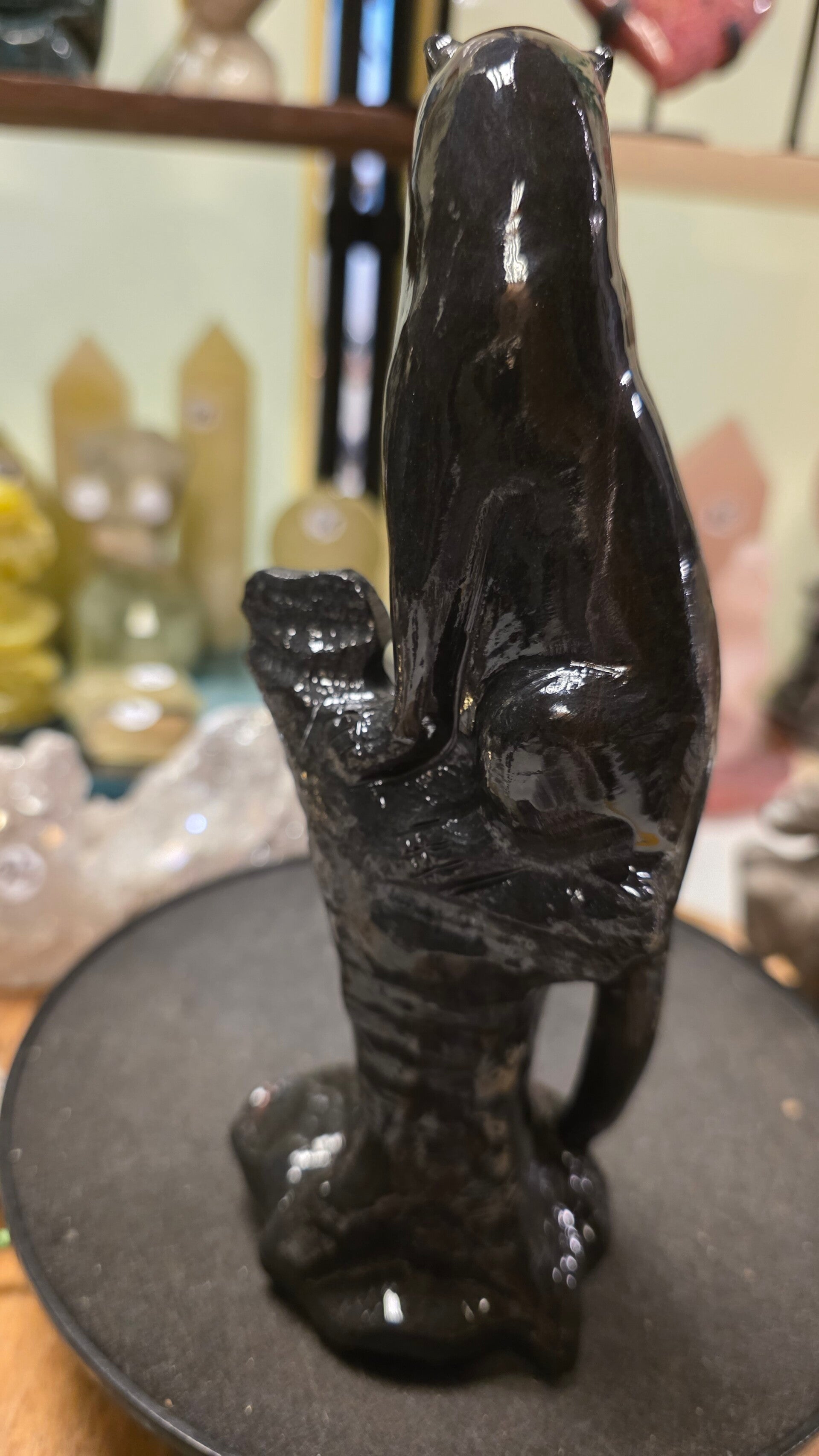 Prachtige zwarte luipaard op Boomstronk van Obdidaan hij is 20 cm hoog en 9 cm breed hij weegt 775 gram
